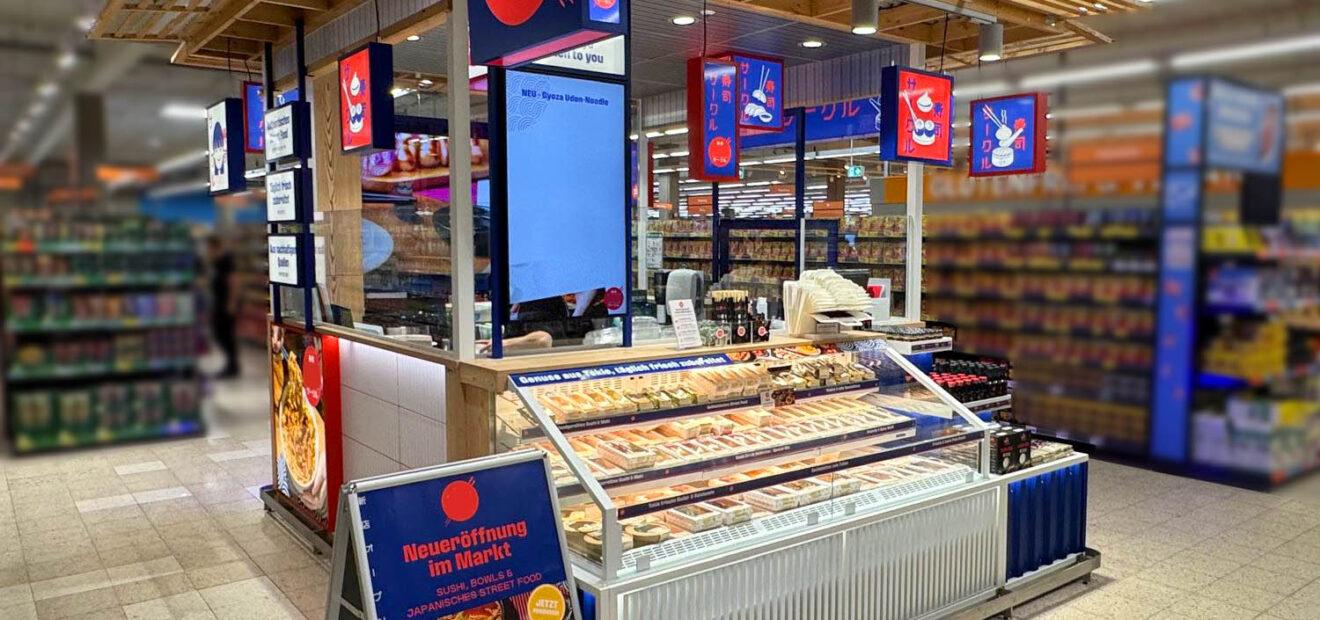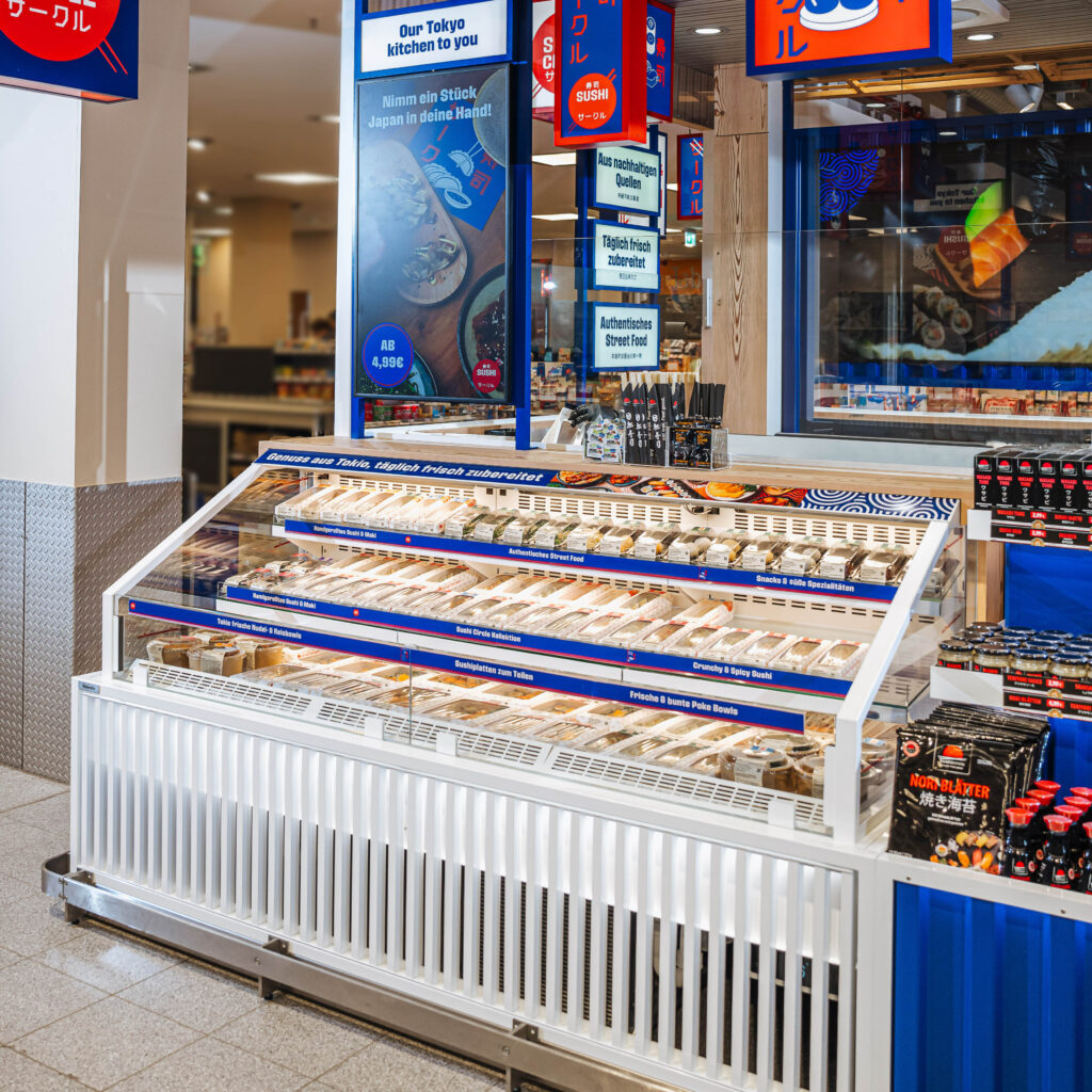 ie Umsetzung der Sushi-Bar im Shop-in-Shop-System wurde mit einem Ergebnis abgeschlossen, das in jeder Hinsicht überzeugt. Die gestellten Anforderungen – lebensmittelkonforme Ausführung, wirtschaftliche Fertigung und ein unkomplizierter Aufbau vor Ort – konnten vollständig erfüllt werden.